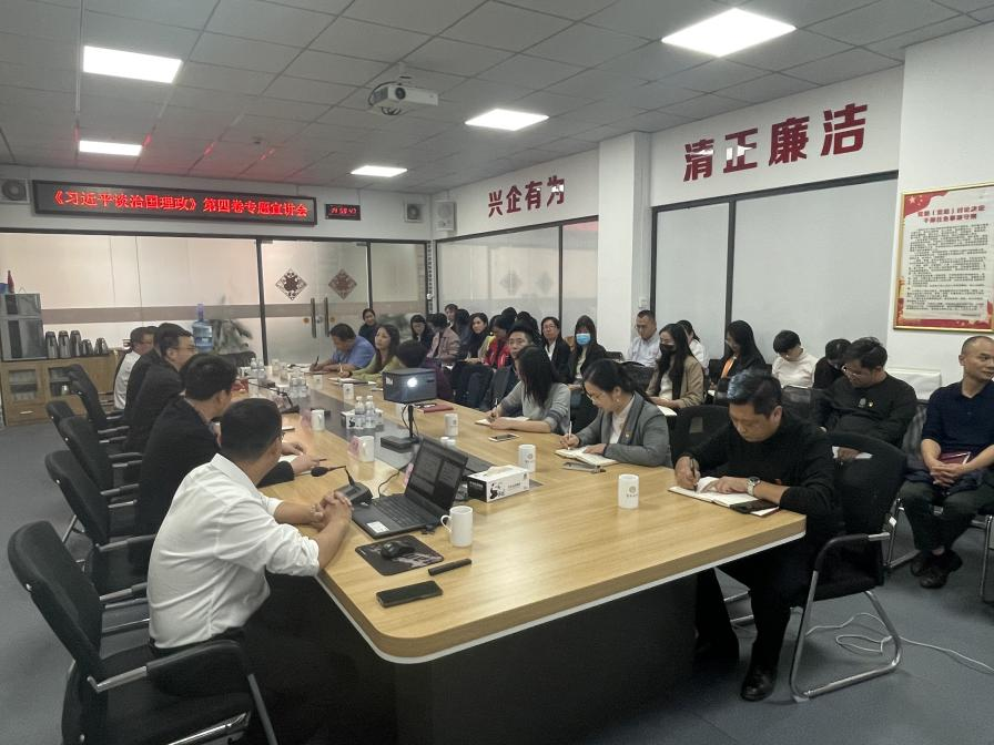為進(jìn)一步深入學(xué)習(xí)貫徹習(xí)近平新時(shí)代中國特色社會(huì)主義思想,11月18日,金財(cái)集團(tuán)黨委邀請(qǐng)了廣東南嶺干部學(xué)院陳倫盛副院長(zhǎng)蒞臨我司就《習(xí)近平談治國理政》第四卷進(jìn)行專題宣講。會(huì)議由集團(tuán)黨委書記、董事長(zhǎng)蔡秉智主持,黨委副書記、紀(jì)委書記喻招文,黨委領(lǐng)導(dǎo)班子成員藍(lán)劍屏、黃國興、劉志軍,全體黨員和中層及以上管理人員參加本次會(huì)議。 會(huì)上,陳倫盛先全面介紹了《習(xí)近平談治國理政》第四卷主要內(nèi)容,指出《習(xí)近平談治國理政》第四卷與前三卷一脈相承、有機(jī)統(tǒng)一,是全面系統(tǒng)反映習(xí)近平新時(shí)代中國特色社會(huì)主義思想的權(quán)威著作;再針對(duì)“準(zhǔn)確把握新發(fā)展階段”“完整、準(zhǔn)確、全面貫徹新發(fā)展理念”“加快構(gòu)建新發(fā)展格局”等三個(gè)方面深入淺出地進(jìn)行了詳細(xì)闡述。宣講主題鮮明、視野寬闊、內(nèi)涵豐富,既體現(xiàn)了深厚的理論素養(yǎng),又融入了深邃的現(xiàn)實(shí)思考,對(duì)集團(tuán)廣大黨員干部更好地把握習(xí)近平新時(shí)代中國特色社會(huì)主義思想的核心要義、精神實(shí)質(zhì)、豐富內(nèi)涵、實(shí)踐要求,推動(dòng)黨的創(chuàng)新理論走深走實(shí)走心,具有很強(qiáng)的指導(dǎo)作用。 會(huì)議最后,蔡秉智強(qiáng)調(diào),集團(tuán)全體黨員干部要提高政治站位,切實(shí)把思想和行動(dòng)統(tǒng)一到習(xí)近平總書記重要講話精神上來,要把深入學(xué)習(xí)貫徹《習(xí)近平談治國理政》第四卷作為重要政治任務(wù)之一,扎實(shí)開展學(xué)習(xí)研討,切實(shí)做到讀原著、學(xué)原文、悟原理,在整體把握的前提下,領(lǐng)悟好重點(diǎn)和創(chuàng)新點(diǎn),深學(xué)細(xì)悟、融會(huì)貫通;自覺用習(xí)近平新時(shí)代中國特色社會(huì)主義思想武裝頭腦、指導(dǎo)實(shí)踐,提升解決問題和困難的能力,把學(xué)習(xí)成效轉(zhuǎn)化為做好本職工作、推動(dòng)企業(yè)發(fā)展的強(qiáng)大動(dòng)力,加快推動(dòng)集團(tuán)各項(xiàng)工作再登新臺(tái)階、再上新水平、再創(chuàng)新局面,以實(shí)際行動(dòng)踐行黨的二十大精神。 |